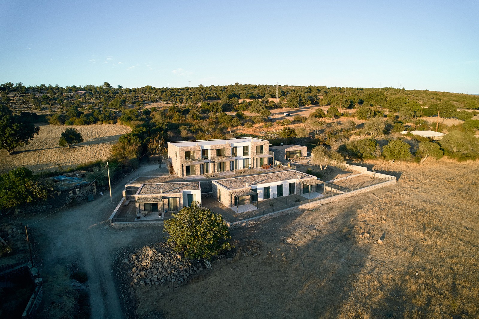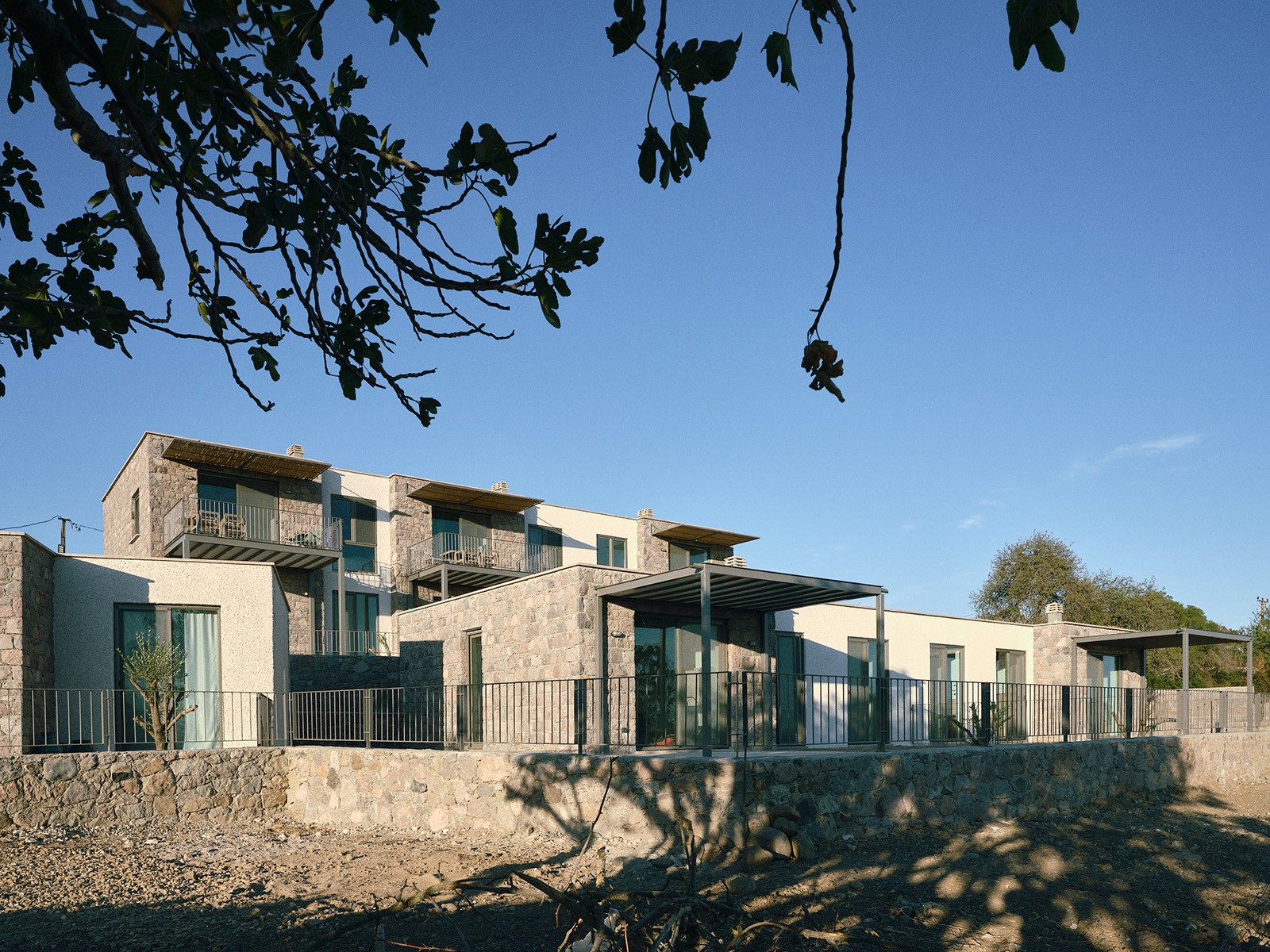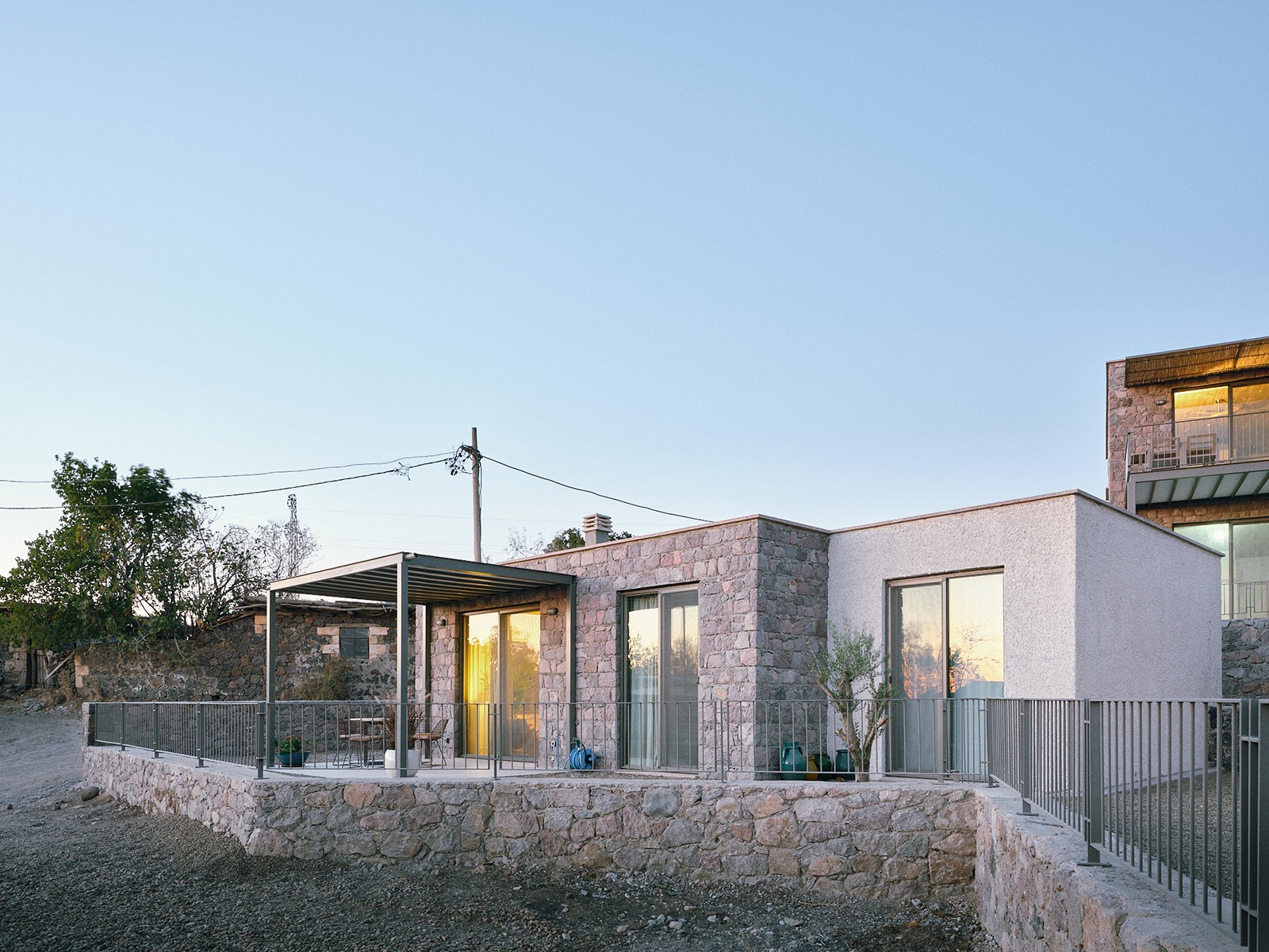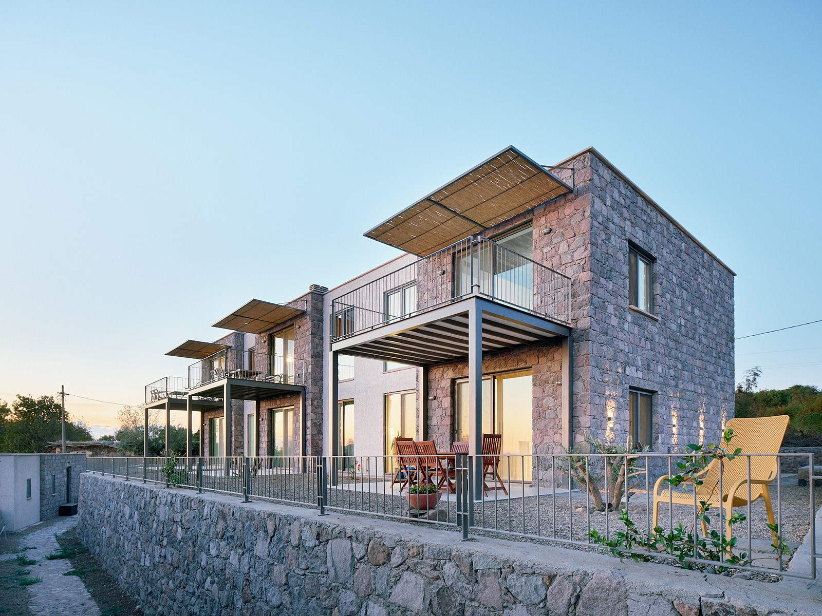 Tartışık Doğu’da, 4 adet 1+1, 6 adet 2+1, 2 adet de 3+1 şeklinde kurgulanan ev bulunuyor. Her bir ev, yöreden çıkan doğal taş cephe kaplaması ile öne çıkıyor. Evlerin önüne eklenen ve ön cephe boyunca devam eden çelik taşıyıcılı pergolalar, dış mekan kullanımını kolaylaştırıyor. Cephelerdeki sadelik ve doğallık hissi, zeminde ve ıslak hacimlerde kullanılan seramik kaplama ile duvar yüzeyleri ve sabit mobilyalardaki pastel renkler sayesinde iç mekanda da sürdürülüyor. Evlerin planlarında, kullanım kolaylığı ve ferahlık öne çıkıyor. 2+1 ve 3+1 evlerde çatı yüksekliği mekana dahil edilerek bu ferahlık pekiştiriliyor.