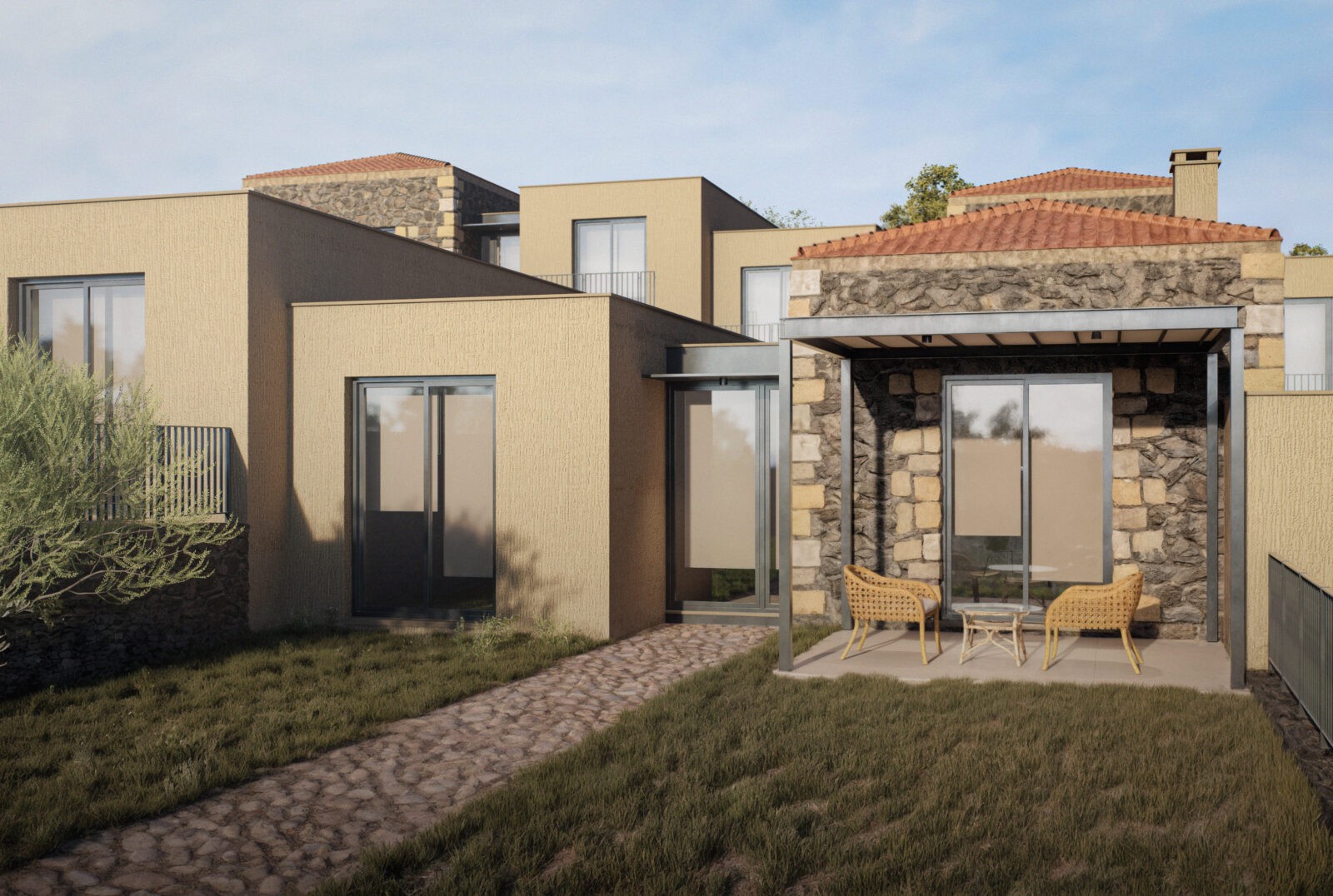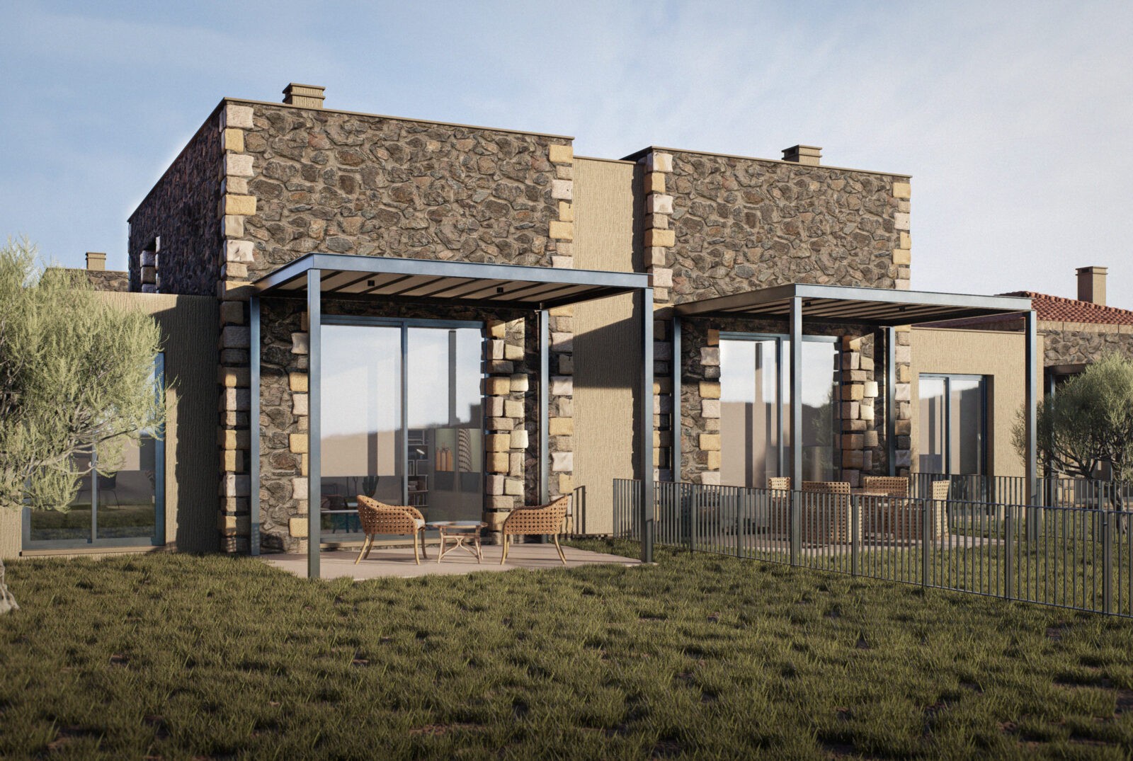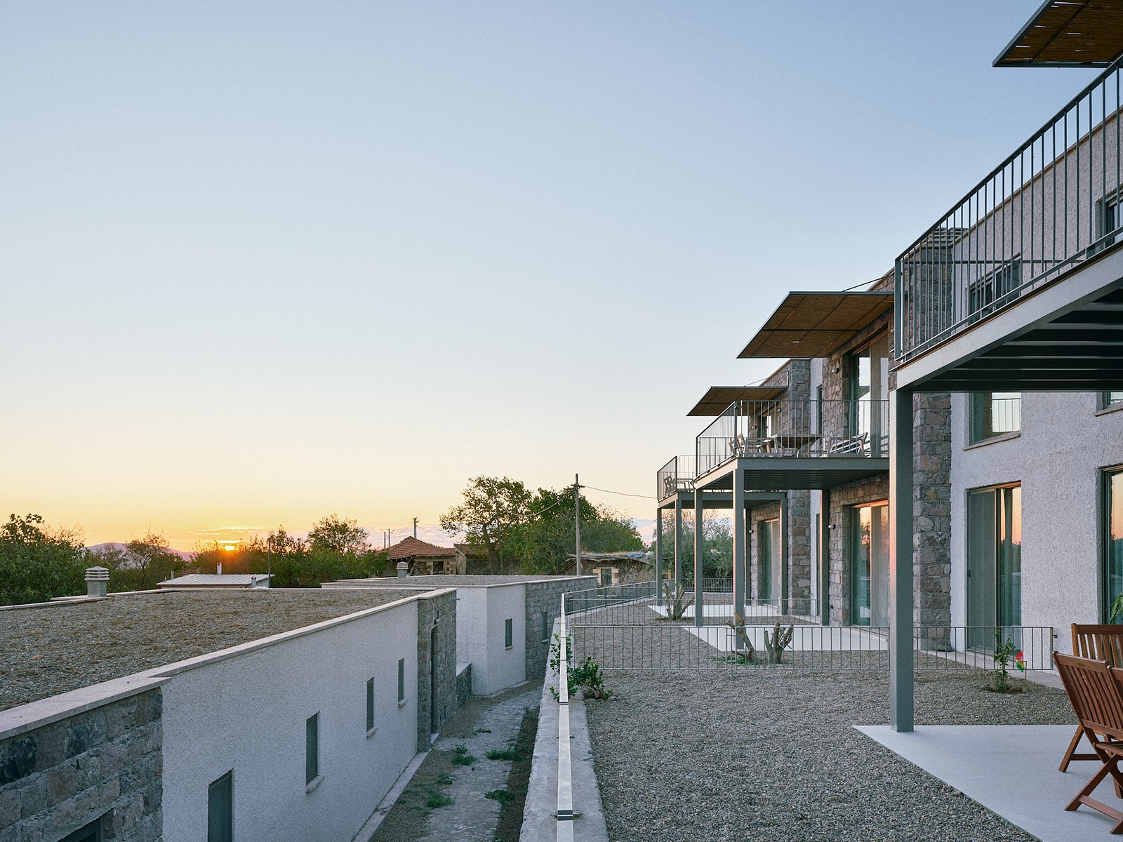 Tartışık Doğu’da, 4 adet 1+1, 6 adet 2+1, 2 adet de 3+1 şeklinde kurgulanan ev bulunuyor. Her bir ev, yöreden çıkan doğal taş cephe kaplaması ile öne çıkıyor. Evlerin önüne eklenen ve ön cephe boyunca devam eden çelik taşıyıcılı pergolalar, dış mekan kullanımını kolaylaştırıyor. Cephelerdeki sadelik ve doğallık hissi, zeminde ve ıslak hacimlerde kullanılan seramik kaplama ile duvar yüzeyleri ve sabit mobilyalardaki pastel renkler sayesinde iç mekanda da sürdürülüyor. Evlerin planlarında, kullanım kolaylığı ve ferahlık öne çıkıyor. 2+1 ve 3+1 evlerde çatı yüksekliği mekana dahil edilerek bu ferahlık pekiştiriliyor.