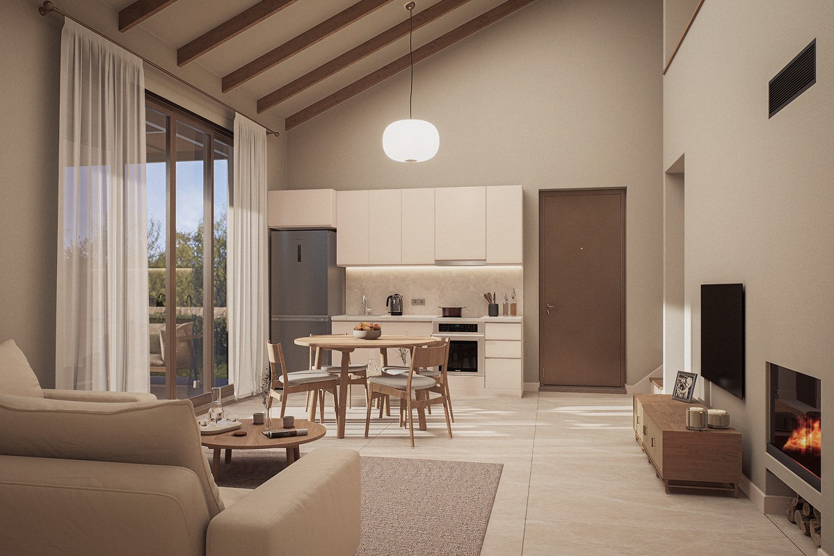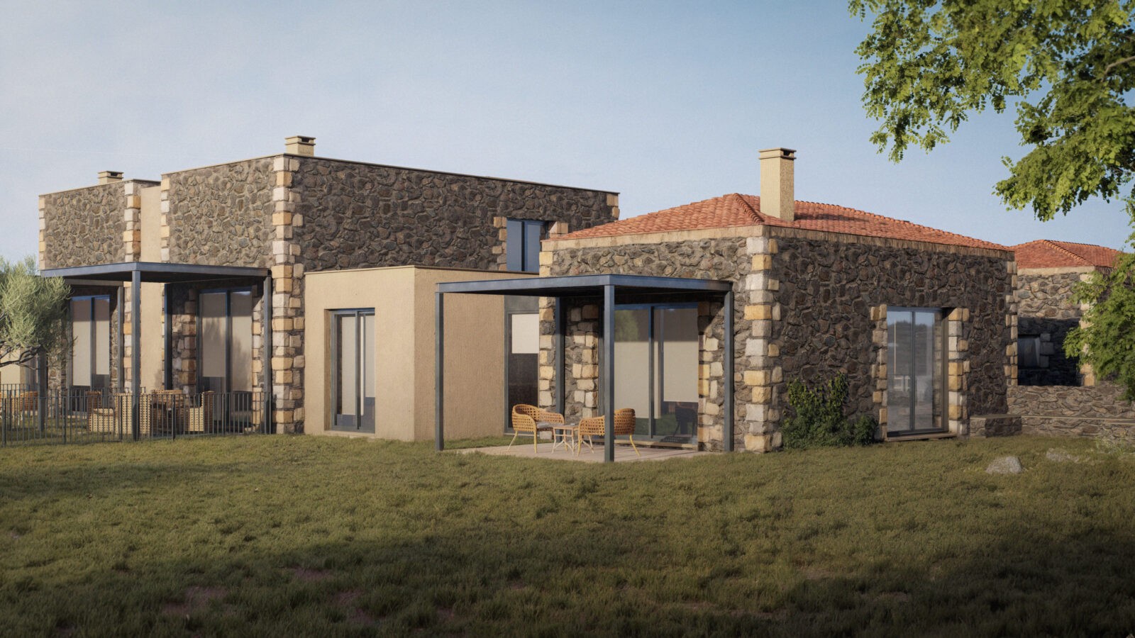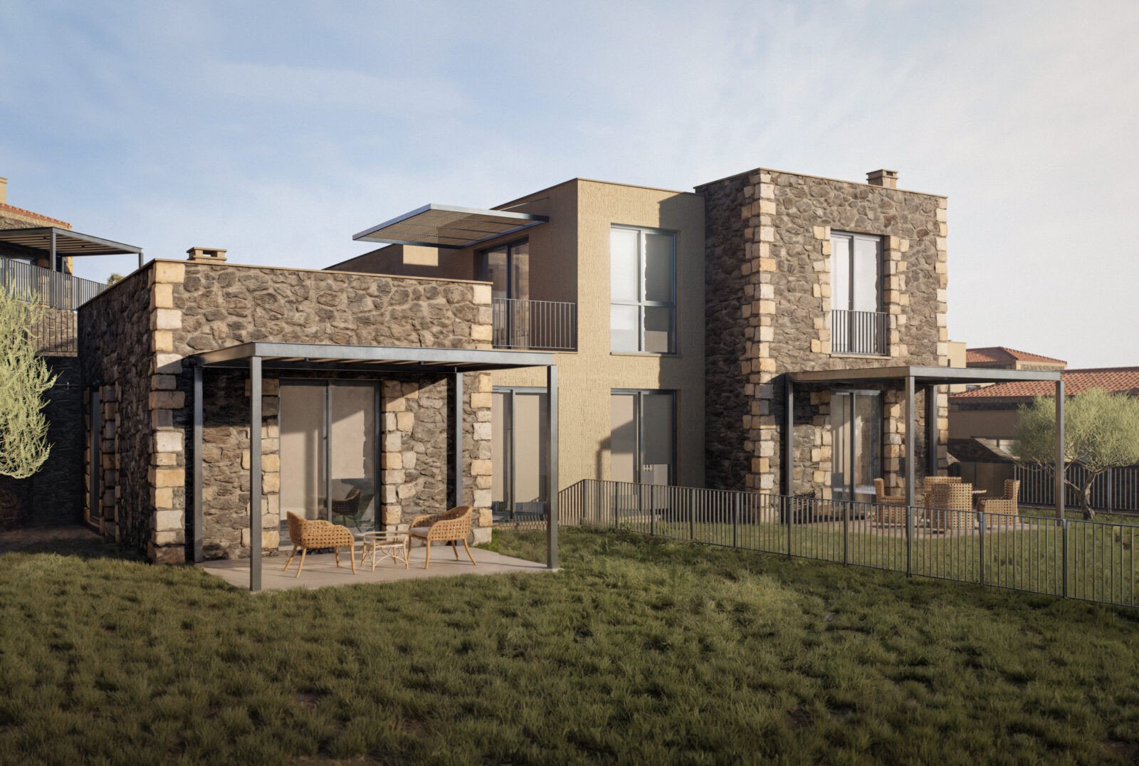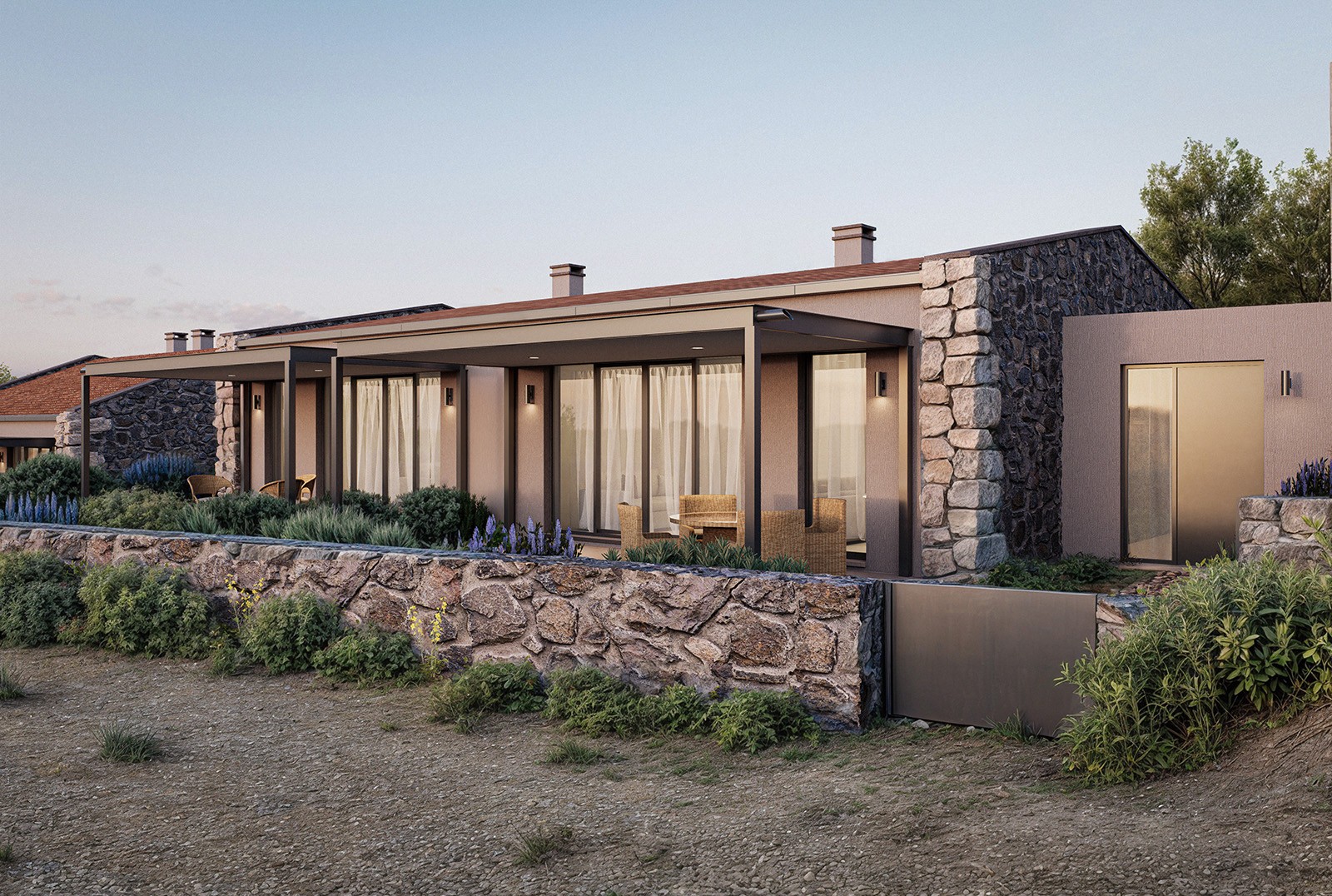 Tartışık Doğu’da, 4 adet 1+1, 6 adet 2+1, 2 adet de 3+1 şeklinde kurgulanan ev bulunuyor. Her bir ev, yöreden çıkan doğal taş cephe kaplaması ile öne çıkıyor. Evlerin önüne eklenen ve ön cephe boyunca devam eden çelik taşıyıcılı pergolalar, dış mekan kullanımını kolaylaştırıyor. Cephelerdeki sadelik ve doğallık hissi, zeminde ve ıslak hacimlerde kullanılan seramik kaplama ile duvar yüzeyleri ve sabit mobilyalardaki pastel renkler sayesinde iç mekanda da sürdürülüyor. Evlerin planlarında, kullanım kolaylığı ve ferahlık öne çıkıyor. 2+1 ve 3+1 evlerde çatı yüksekliği mekana dahil edilerek bu ferahlık pekiştiriliyor.