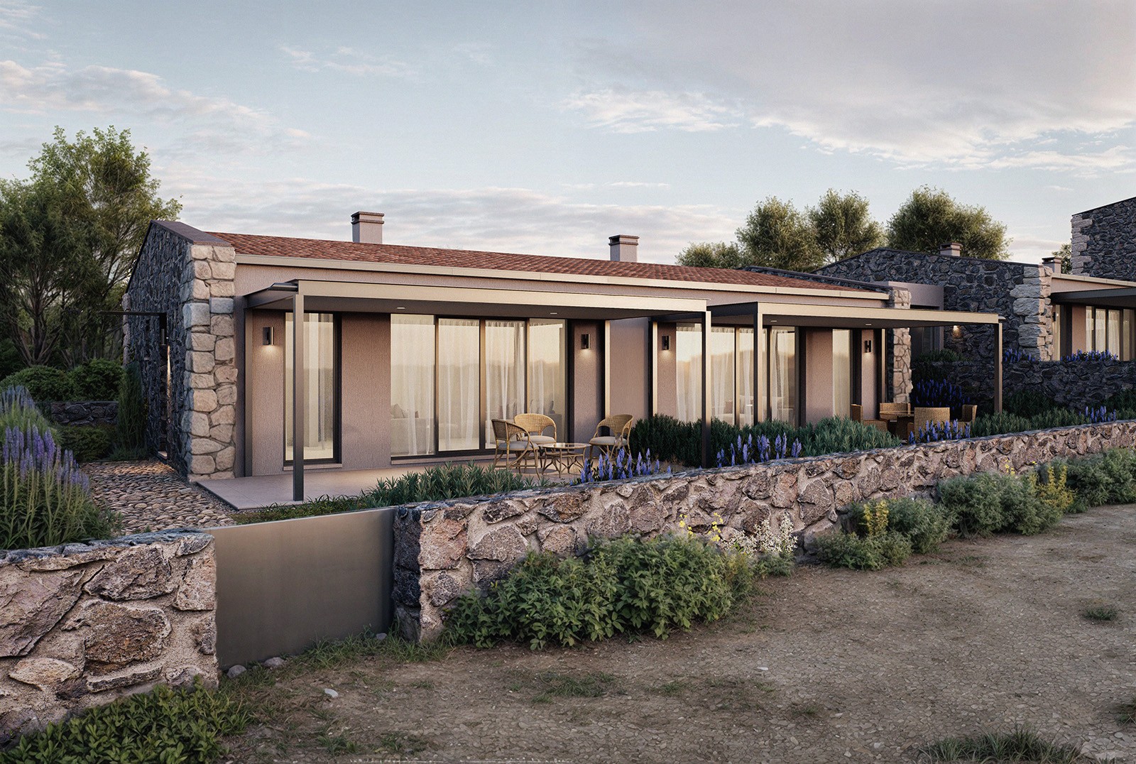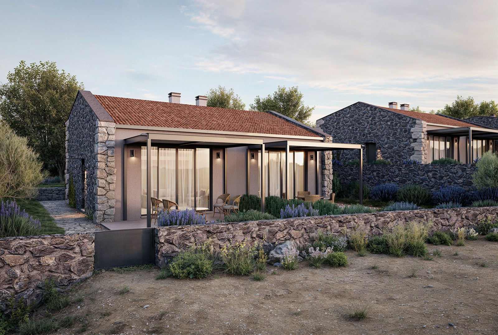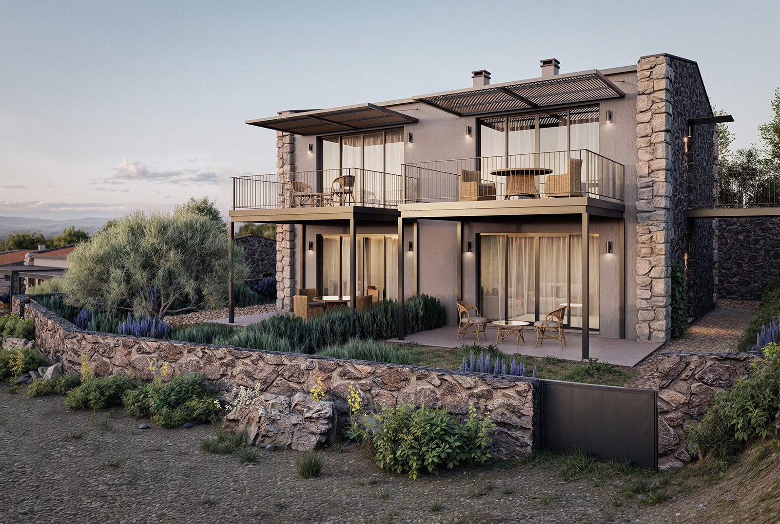 Tartışık Vadi iki fazda inşa edilecek, farklı tipte konutlardan oluşan bir konut yerleşkesidir. Eğimli topoğrafyaya uyumlu yerleşimi ve parçalı kütlelerden oluşan birimleriyle, bir yandan manzaraya yönelmekte, bir yandan da köy dokusuyla diyalog kuran bir siluet oluşturmaktadır. 2+1 ve 3+1 konutlarda, salon ve açık mutfak kırma çatılı, görece yüksek kütleler içinde çözülmüştür. Yatak odalarını barındıran teras çatılı ve daha alçak tutulmuş kütlelerse, evlerin önüyle arkasını bağlayan giriş koridorları vasıtasıyla salon kütlelerinden ayrıştırılmıştır. 1+1 konutların bir kısmı asma katlı olarak tasarlanmış, bir kısmı tek katlı birimler olarak düşünülmüştür. Tasarımdaki bu parçacıl anlayış, çatı ve gabariler dışında, doğal taş ve pürüzlü sıvalı yüzeylerin birlikteliğiyle daha da vurgulanır. Söz konusu birliktelik cepheye derinlik katarken, köy dokusuyla da güçlü bir bağ kurar. Çelik pergolalı verandalar, iç mekanı dışarıya doğru genişleterek bakışı ufka doğru yönlendirir. Tartışık Vadi, topoğrafyayla örtüşen ve manzaraya yönelen yerleşimi, ölçeğe gösterdiği dikkat ve yere özgü malzeme seçimiyle, bölgenin ruhunu güncel bir bakışla yeniden yorumluyor.